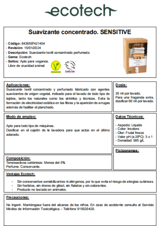 Suavizante concentrado con ingredientes de origen vegetal que deja tu ropa con un agradable perfume. Evita la electricidad estática en las fibras y facilita el planchado. Producto hipoalergénico.