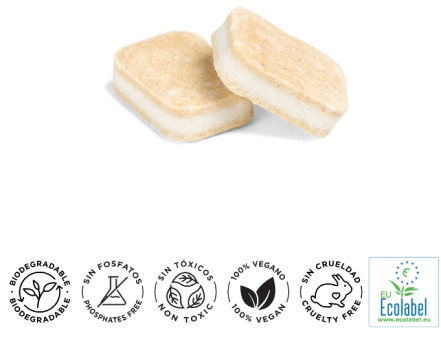 Lavavajillas concentrado en monodosis hidrosolubles de rápida disolución que elimina eficazmente las manchas más incrustadas. Zero waste.
